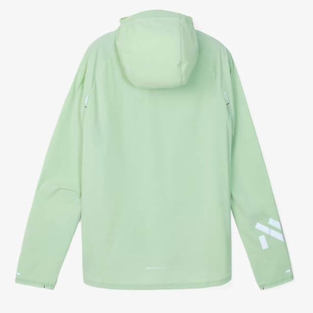 Bunda je vyrobena z recyklovaného materiálu (100 % recyklovaný polyester), váží okolo 120 gramů a je vybavena reflexními prvky pro bezpečnost při běhu za slabého světla. Součástí je integrovaná kapuce a dvoucestný ventilační zip pro regulaci prodyšnosti. Po použití ji jednoduše sbalíte do kapuce, která zároveň slouží jako obal.