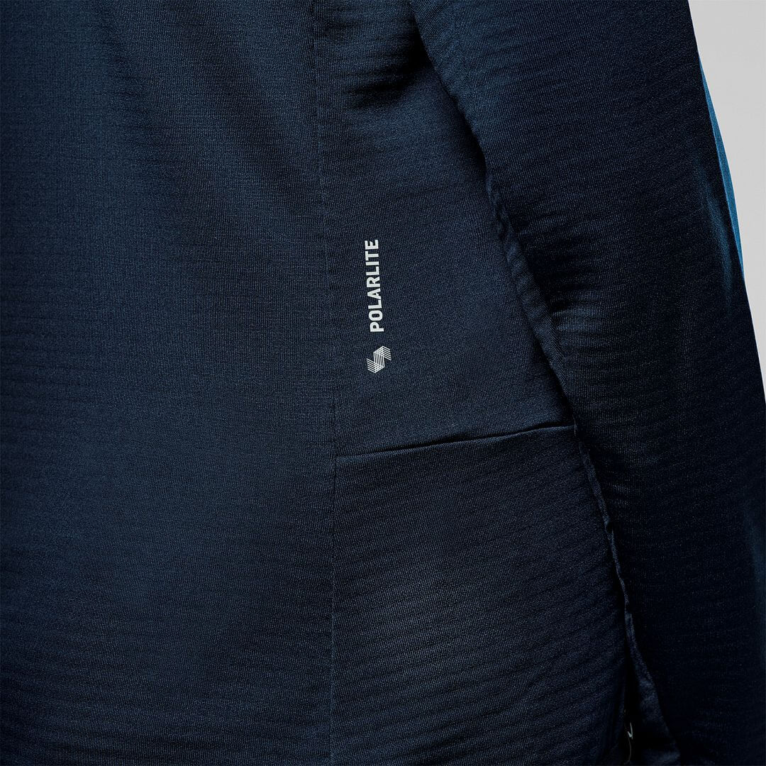 Vyrobena je z vodoodpudivého syntetického fleecu Polarlite, který i rychle schne, pokud vás zastihne nepříznivé počasí. Měkký a pohodlný materiál má na vnějším povrchu výrazný pruhovaný design, zatímco vnitřní stranou zůstává příjemně zahřívající kartáčovaná struktura.