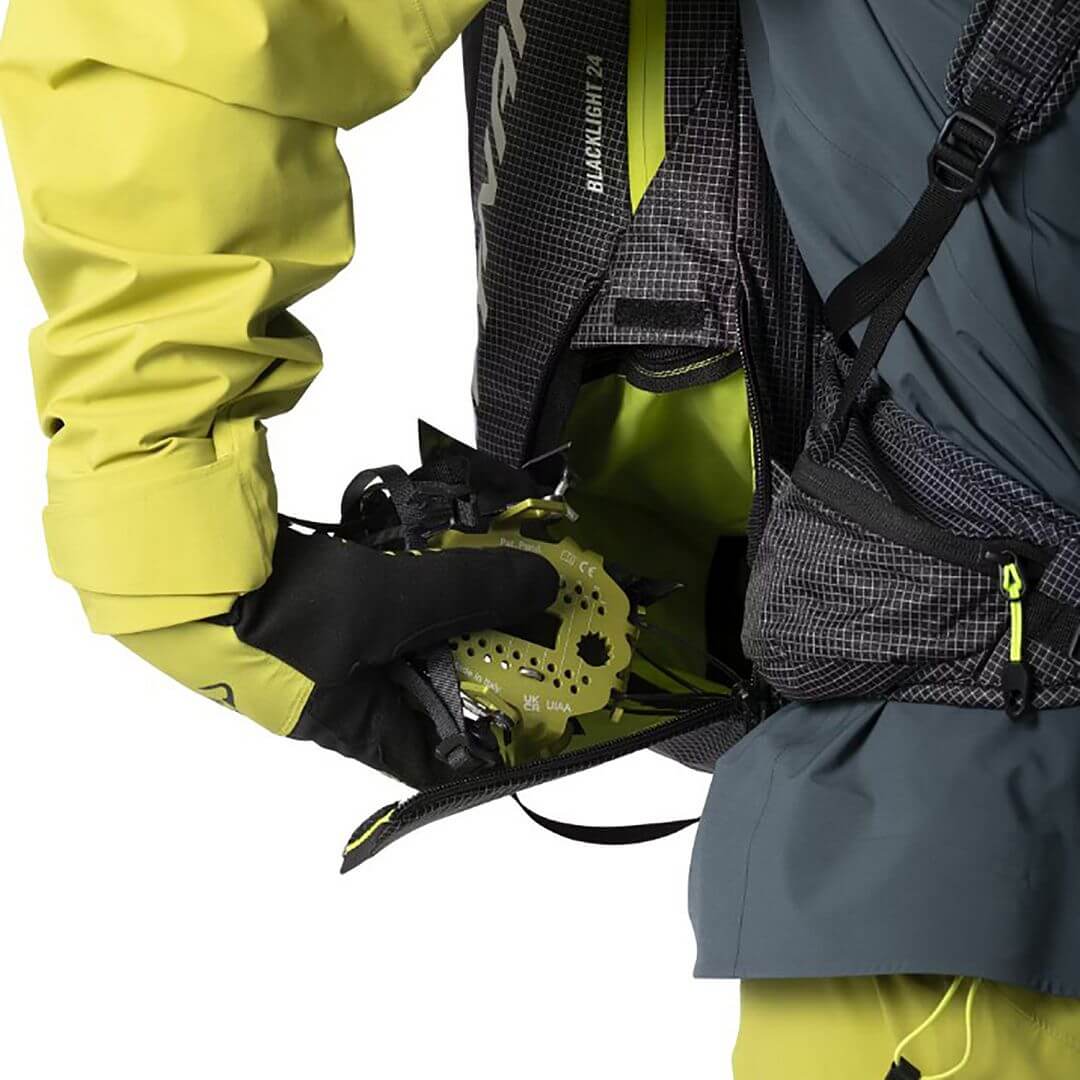 Blacklight 24 nabízí inteligentní organizaci vybavení včetně samostatné kapsy na mačky a odděleného prostoru pro lavinovou výbavu (lopata a sonda). Velký zipový vstup do hlavní komory umožňuje rychlý přístup k obsahu. Praktický rychlý diagonální systém uchycení lyží funguje bez nutnosti sundávat batoh, což oceníte zejména při častých přechodech mezi výstupem a chůzí.